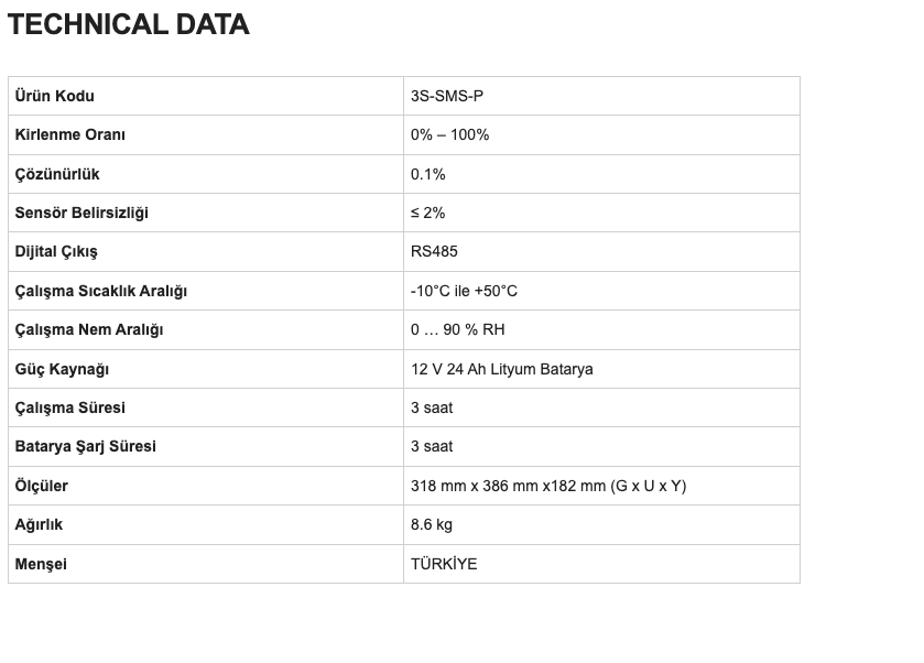 Cihaz, ışık yansıması ve saçılımı prensiplerini kullanarak panel yüzeyindeki toz birikimini değerlendirir. Kullanıcılar, cihazın entegre LCD dokunmatik ekranı aracılığıyla panel hücresi rengi, toz tonu ve toz rengi gibi temel parametreleri girer. Sensör içindeki lambalar panel yüzeyine yüksek lümen değerinde stabil ışık yansıtır. Yansıyan ışık, mekanik yapı içerisinde bulunan yüksek hassasiyetli sensörler tarafından algılanır ve ölçülür. Elde edilen sonuçlar, gelişmiş bir mikrodenetleyici tarafından işlenerek ekran üzerinde dijital olarak görüntülenir, böylece verilerin kolayca yorumlanması sağlanır. Taşınabilirliği ve kullanım kolaylığı ile öne çıkan 3S-SMS-P, şarj edilebilir bir batarya ile çalışır ve 3 saate kadar kullanım süresi sunar.